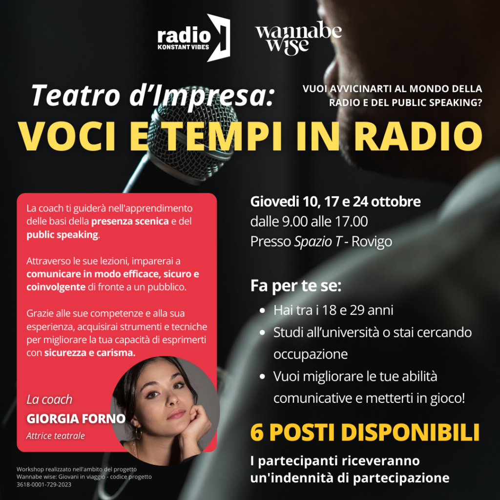 I ragazzi che si iscriveranno al corso “Teatro d’Impresa – Voci e tempi in radio”, parteciperanno a tre dinamiche lezioni di formazioni attiva, guidati dall’attrice Giorgia Forno che li guiderà nell’apprendimento delle basi della presenza scenica e del public speaking, nell’uso della prossemica e della gestualità.