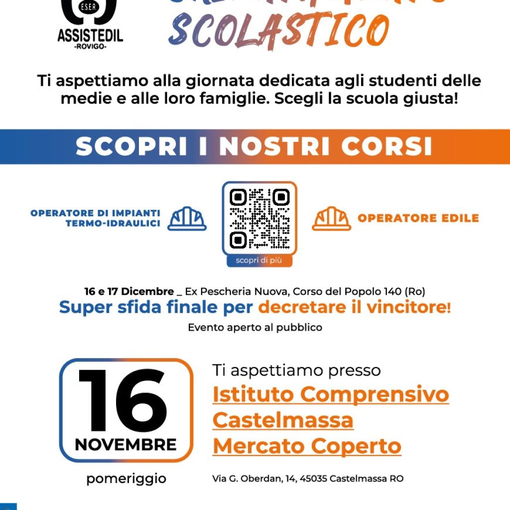 Tornano le Giornate di Orientamento con la Scuola Edile di Rovigo. Tre le date imperdibili che permetteranno agli studenti in procinto di scegliere le scuole superiori, di scoprire da vicino il nostro mondo.