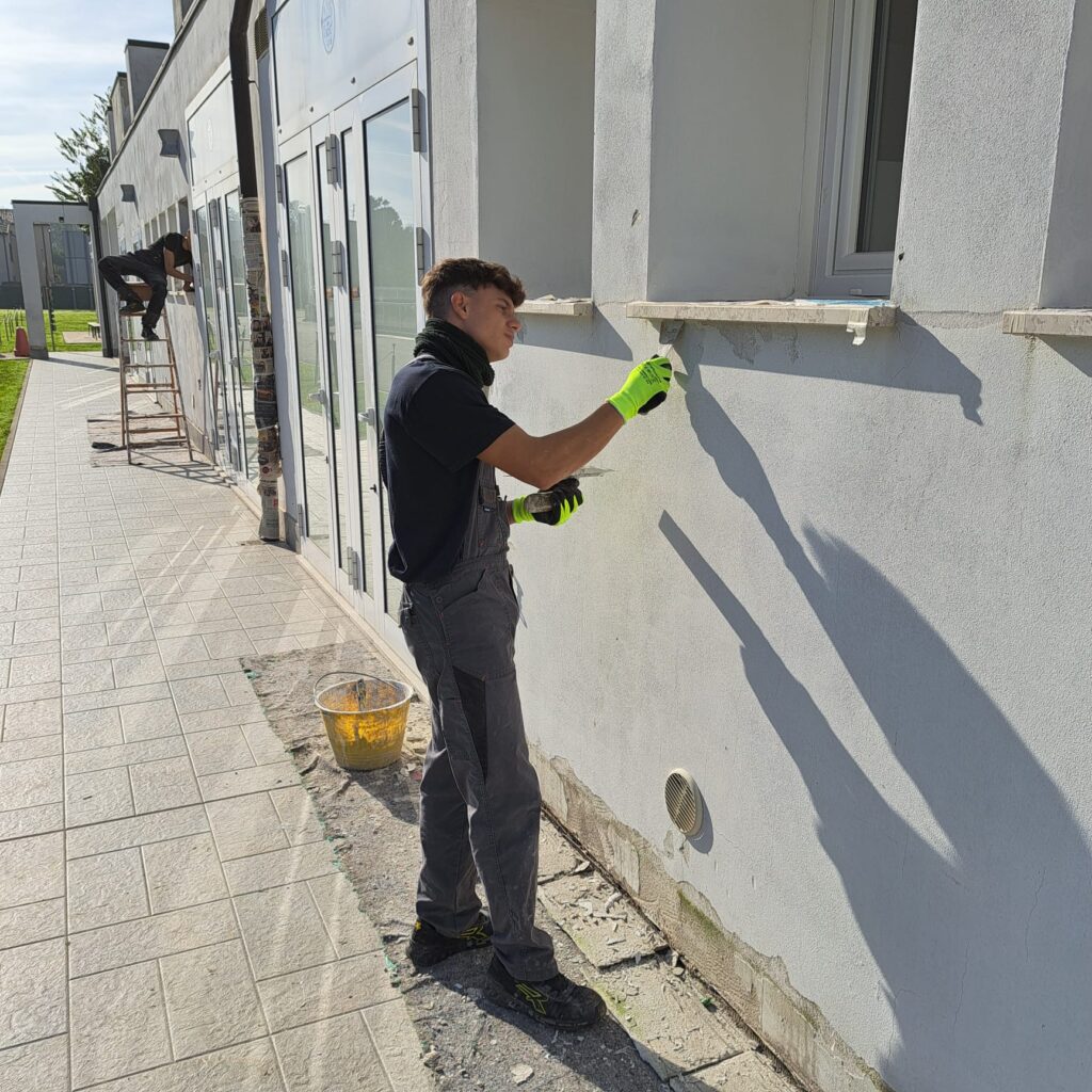 Dopo aver provveduto alla chiusura delle fessurazioni strutturali, gli studenti della scuola edile di Rovigo hanno provveduto a dare una doppia stesura di colore al quarzo sulle pareti esterne della palazzina servizi.