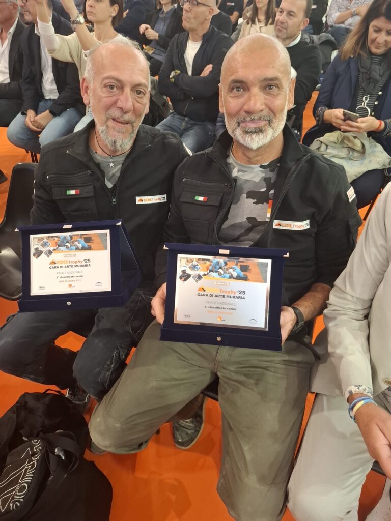 Sale sul podio la nostra squadra senior: Gianni Battizocco ed Enrico Pisani (in sostituzione del titolare Roberto Guizzardi) hanno conquistato la medaglia di bronzo alle finali nazionali del concorso di Arte Muraria Ediltrophy 2025, portando a casa un meritatissimo terzo posto e tenendo così alti i colori di Formedil Rovigo.